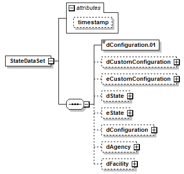 | <xs:element name="StateDataSet"> <xs:complexType> <xs:sequence> <xs:element id="dConfiguration.StateAssociatedwiththeCertificationLicensureLevels" name="dConfiguration.01" type="ANSIStateCode"/> <xs:complexType> <xs:sequence> <xs:element id="dCustomConfiguration.dCustomGroup" maxOccurs="unbounded" minOccurs="0" name="dCustomConfiguration.CustomGroup"> <xs:complexType> <xs:sequence> <xs:element id="dCustomConfiguration.dCustomDataElementTitle" minOccurs="0" name="dCustomConfiguration.01"> <xs:complexType> <xs:simpleContent> </xs:extension> </xs:simpleContent> </xs:complexType> </xs:element> <xs:element id="dCustomConfiguration.dCustomDefinition" minOccurs="0" name="dCustomConfiguration.02" type="CustomDefinition"/> <xs:element id="dCustomConfiguration.dCustomDataType" minOccurs="0" name="dCustomConfiguration.03" type="CustomDataType"/> <xs:element id="dCustomConfiguration.dCustomDataElementRecurrence" minOccurs="0" name="dCustomConfiguration.04" type="YesNoValues"/> <xs:element id="dCustomConfiguration.dCustomDataElementUsage" minOccurs="0" name="dCustomConfiguration.05" type="ElementUsage"/> <xs:element id="dCustomConfiguration.dCustomDataElementPotentialValues" maxOccurs="unbounded" minOccurs="0" name="dCustomConfiguration.06"> <xs:complexType> <xs:simpleContent> </xs:extension> </xs:simpleContent> </xs:complexType> </xs:element> <xs:element id="dCustomConfiguration.dCustomAcceptableNV" maxOccurs="unbounded" minOccurs="0" name="dCustomConfiguration.07" type="NV"/> <xs:element id="dCustomConfiguration.dCustomAcceptablePN" maxOccurs="unbounded" minOccurs="0" name="dCustomConfiguration.08" type="PN"/> <xs:element id="dCustomConfiguration.CustomDataElementGroupingID" minOccurs="0" name="dCustomConfiguration.09" type="CorrelationID"/> </xs:sequence> </xs:complexType> </xs:element> </xs:sequence> </xs:complexType> </xs:element> <xs:complexType> <xs:sequence> <xs:element id="eCustomConfiguration.eCustomGroup" maxOccurs="unbounded" minOccurs="0" name="eCustomConfiguration.CustomGroup"> <xs:complexType> <xs:sequence> <xs:element id="eCustomConfiguration.eCustomDataElementTitle" minOccurs="0" name="eCustomConfiguration.01"> <xs:complexType> <xs:simpleContent> </xs:extension> </xs:simpleContent> </xs:complexType> </xs:element> <xs:element id="eCustomConfiguration.eCustomDefinition" minOccurs="0" name="eCustomConfiguration.02" type="CustomDefinition"/> <xs:element id="eCustomConfiguration.eCustomDataType" minOccurs="0" name="eCustomConfiguration.03" type="CustomDataType"/> <xs:element id="eCustomConfiguration.eCustomDataElementRecurrence" minOccurs="0" name="eCustomConfiguration.04" type="YesNoValues"/> <xs:element id="eCustomConfiguration.eCustomDataElementUsage" minOccurs="0" name="eCustomConfiguration.05" type="ElementUsage"/> <xs:element id="eCustomConfiguration.eCustomDataElementPotentialValues" maxOccurs="unbounded" minOccurs="0" name="eCustomConfiguration.06"> <xs:complexType> <xs:simpleContent> </xs:extension> </xs:simpleContent> </xs:complexType> </xs:element> <xs:element id="eCustomConfiguration.eCustomAcceptableNV" maxOccurs="unbounded" minOccurs="0" name="eCustomConfiguration.07" type="NV"/> <xs:element id="eCustomConfiguration.eCustomAcceptablePN" maxOccurs="unbounded" minOccurs="0" name="eCustomConfiguration.08" type="PN"/> <xs:element id="eCustomConfiguration.CustomDataElementGroupingID" minOccurs="0" name="eCustomConfiguration.09" type="CorrelationID"/> </xs:sequence> </xs:complexType> </xs:element> </xs:sequence> </xs:complexType> </xs:element> <xs:complexType> <xs:sequence> <xs:complexType> <xs:simpleContent> </xs:extension> </xs:simpleContent> </xs:complexType> </xs:element> </xs:sequence> </xs:complexType> </xs:element> <xs:complexType> <xs:sequence> <xs:complexType> <xs:simpleContent> </xs:extension> </xs:simpleContent> </xs:complexType> </xs:element> </xs:sequence> </xs:complexType> </xs:element> <xs:complexType> <xs:sequence> <xs:element id="dConfiguration.StateCertificationLicensureLevels" maxOccurs="unbounded" minOccurs="0" name="dConfiguration.02"> <xs:complexType> <xs:simpleContent> </xs:simpleContent> </xs:complexType> </xs:element> <xs:element id="dConfiguration.AgencyProcedureGroup" maxOccurs="unbounded" minOccurs="0" name="dConfiguration.ProcedureGroup"> <xs:complexType> <xs:sequence> <xs:element id="dConfiguration.EMSPersonnelLevelPermittedtoPerformtheProcedure" minOccurs="0" name="dConfiguration.06"> <xs:complexType> <xs:simpleContent> </xs:simpleContent> </xs:complexType> </xs:element> <xs:element id="dConfiguration.ProceduresPermittedbytheState" maxOccurs="unbounded" minOccurs="0" name="dConfiguration.03" nillable="true"> <xs:complexType> <xs:simpleContent> <xs:simpleType> </xs:simpleType> </xs:attribute> </xs:extension> </xs:simpleContent> </xs:complexType> </xs:element> </xs:sequence> </xs:complexType> </xs:element> <xs:element id="dConfiguration.AgencyMedicationGroup" maxOccurs="unbounded" minOccurs="0" name="dConfiguration.MedicationGroup"> <xs:complexType> <xs:sequence> <xs:element id="dConfiguration.PersonnelLevelPermittedtoAdministertheMedication" minOccurs="0" name="dConfiguration.08" type="StateCertificationLicensureLevels"/> <xs:element id="dConfiguration.MedicationsPermittedbytheState" maxOccurs="unbounded" minOccurs="0" name="dConfiguration.04" nillable="true"> <xs:complexType> <xs:simpleContent> <xs:simpleType> </xs:simpleType> </xs:attribute> </xs:extension> </xs:simpleContent> </xs:complexType> </xs:element> </xs:sequence> </xs:complexType> </xs:element> <xs:element id="dConfiguration.ProtocolsPermittedbytheState" maxOccurs="unbounded" minOccurs="0" name="dConfiguration.05" nillable="true"> <xs:complexType> <xs:simpleContent> <xs:simpleType> </xs:simpleType> </xs:attribute> </xs:extension> </xs:simpleContent> </xs:complexType> </xs:element> </xs:sequence> </xs:complexType> </xs:element> <xs:complexType> <xs:sequence> <xs:complexType> <xs:sequence> <xs:element id="dAgency.EMSAgencyUniqueStateID" minOccurs="0" name="dAgency.01" type="EMSAgencyStateI