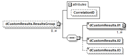 | <xs:element id="dCustomConfiguration.dResultscGroup" maxOccurs="unbounded" minOccurs="0" name="dCustomResults.ResultsGroup"> <xs:complexType> <xs:sequence> <xs:element id="dCustomConfiguration.dCustomDataElementResult" maxOccurs="unbounded" minOccurs="1" name="dCustomResults.01" nillable="true"> <xs:complexType> <xs:simpleContent> </xs:extension> </xs:simpleContent> </xs:complexType> </xs:element> <xs:element id="dCustomConfiguration.dCustomDataElementReference" minOccurs="1" name="dCustomResults.02" type="CorrelationID"/> <xs:element id="dCustomConfiguration.dCustomCorrelationID" minOccurs="0" name="dCustomResults.03" type="CorrelationID"/> </xs:sequence> </xs:complexType> </xs:element> |