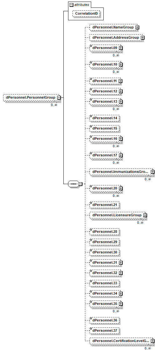 | <xs:element id="dPersonnel.PersonnelGroup" maxOccurs="unbounded" minOccurs="0" name="dPersonnel.PersonnelGroup"> <xs:complexType> <xs:sequence> <xs:complexType> <xs:sequence> <xs:element id="dPersonnel.EMSPersonnelsLastName" minOccurs="0" name="dPersonnel.01" nillable="true"> <xs:complexType> <xs:simpleContent> <xs:simpleType> </xs:simpleType> </xs:attribute> </xs:extension> </xs:simpleContent> </xs:complexType> </xs:element> <xs:element id="dPersonnel.EMSPersonnelsFirstName" minOccurs="0" name="dPersonnel.02" nillable="true"> <xs:complexType> <xs:simpleContent> <xs:simpleType> </xs:simpleType> </xs:attribute> </xs:extension> </xs:simpleContent> </xs:complexType> </xs:element> <xs:element id="dPersonnel.EMSPersonnelsMiddleNameInitial" minOccurs="0" name="dPersonnel.03" nillable="true"> <xs:complexType> <xs:simpleContent> <xs:simpleType> </xs:simpleType> </xs:attribute> </xs:extension> </xs:simpleContent> </xs:complexType> </xs:element> </xs:sequence> </xs:complexType> </xs:element> <xs:complexType> <xs:sequence> <xs:complexType> <xs:simpleContent> </xs:extension> </xs:simpleContent> </xs:complexType> </xs:element> <xs:element id="dPersonnel.EMSPersonnelsCityofResidence" minOccurs="0" name="dPersonnel.05" type="CityGnisCode"/> <xs:element id="dPersonnel.EMSPersonnelsState" minOccurs="0" name="dPersonnel.06" type="ANSIStateCode"/> <xs:element id="dPersonnel.EMSPersonnelsCountry" minOccurs="0" name="dPersonnel.08" type="ANSICountryCodesCAMXUS"/> </xs:sequence> </xs:complexType> </xs:element> <xs:element id="dPersonnel.EMSPersonnelsPhoneNumber" maxOccurs="unbounded" minOccurs="0" name="dPersonnel.09"> <xs:complexType> <xs:simpleContent> </xs:extension> </xs:simpleContent> </xs:complexType> </xs:element> <xs:element id="dPersonnel.EMSPersonnelsEmailAddress" maxOccurs="unbounded" minOccurs="0" name="dPersonnel.10"> <xs:complexType> <xs:simpleContent> </xs:extension> </xs:simpleContent> </xs:complexType> </xs:element> <xs:element id="dPersonnel.EMSPersonnelsDateofBirth" minOccurs="0" name="dPersonnel.11" nillable="true"> <xs:complexType> <xs:simpleContent> <xs:simpleType> </xs:simpleType> </xs:attribute> </xs:extension> </xs:simpleContent> </xs:complexType> </xs:element> <xs:complexType> <xs:simpleContent> <xs:simpleType> </xs:simpleType> </xs:attribute> </xs:extension> </xs:simpleContent> </xs:complexType> </xs:element> <xs:element id="dPersonnel.EMSPersonnelsRace" maxOccurs="unbounded" minOccurs="0" name="dPersonnel.13" nillable="true"> <xs:complexType> <xs:simpleContent> <xs:simpleType> </xs:simpleType> </xs:attribute> </xs:extension> </xs:simpleContent> </xs:complexType> </xs:element> <xs:element id="dPersonnel.EMSPersonnelsCitizenship" minOccurs="0" name="dPersonnel.14" type="ANSICountryCode"/> <xs:element id="dPersonnel.EMSPersonnelsHighestEducationalDegree" minOccurs="0" name="dPersonnel.15" type="PersonnelHighestEducationalDegree"/> <xs:element id="dPersonnel.EMSPersonnelsDegreeSubjectFieldofStudy" maxOccurs="unbounded" minOccurs="0" name="dPersonnel.16"> <xs:complexType> <xs:simpleContent> </xs:extension> </xs:simpleContent> </xs:complexType> </xs:element> <xs:element id="dPersonnel.EMSPersonnelsMotorVehicleLicenseType" maxOccurs="unbounded" minOccurs="0" name="dPersonnel.17"> <xs:complexType> <xs:simpleContent> </xs:extension> </xs:simpleContent> </xs:complexType> </xs:element> <xs:element id="dPersonnel.PersonnelImmunizationsGroup" maxOccurs="unbounded" minOccurs="0" name="dPersonnel.ImmunizationsGroup"> <xs:complexType> <xs:sequence> <xs:element id="dPersonnel.EMSPersonnelsImmunizationStatus" minOccurs="0" name="dPersonnel.18" type="ImmunizationType"/> <xs:element id="dPersonnel.EMSPersonnelsImmunizationYear" minOccurs="0" name="dPersonnel.19" type="Year"/> </xs:sequence> </xs:complexType> </xs:element> <xs:element id="dPersonnel.EMSPersonnelsForeignLanguageAbility" maxOccurs="unbounded" minOccurs="0" name="dPersonnel.20"> <xs:complexType> <xs:simpleContent> </xs:extension> </xs:simpleContent> </xs:complexType> </xs:element> <xs:element id="dPersonnel.EMSPersonnelsAgencyIDNumber" minOccurs="0" name="dPersonnel.21" type="PersonnelAgencyIDNumber"/> <xs:element id="dPersonnel.LicensureGroup" maxOccurs="unbounded" minOccurs="0" name="dPersonnel.LicensureGroup"> <xs:complexType> <xs:sequence> <xs:element id="dPersonnel.EMSPersonnelsStateofLicensure" minOccurs="0" name="dPersonnel.22" nillable="true"> <xs:complexType> <xs:simpleContent> <xs:simpleType> </xs:simpleType> </xs:attribute> </xs:extension> </xs:simpleContent> </xs:complexType> </xs:element> <xs:element id="dPersonnel.EMSPersonnelsStateLicensureIDNumber" minOccurs="0" name="dPersonnel.23" nillable="true"> <xs:complexType> <xs:simpleContent> <xs:simpleType> </xs:simpleType> </xs:attribute> </xs:extension> </xs:simpleContent> </xs:complexType> </xs:element> <xs:element id="dPersonnel.EMSPersonnelsStateEMSCertificationLicensureLevel" minOccurs="0" name="dPersonnel.24" nillable="true"> <xs:complexType> <xs:simpleContent> <xs:simpleType> </xs:simpleType> </xs:attribute> </xs:extension> </xs:simpleContent> </xs:complexType> </xs:element> <xs:element id="dPersonnel.EMSPersonnelsStateEMSCurrentCertificationDate" minOccurs="0" name="dPersonnel.25" type="DateType"/> <xs:element id="dPersonnel.EMSPersonnelsInitialStateLicensureIssueDate" minOccurs="0" name="dPersonnel.26" type="DateType"/> <xs:element id="dPersonnel.EMSPersonnelsCurrentStateLicensureExpirationDate" minOccurs="0" name="dPersonnel.27" type="DateType"/> </xs:sequence> </xs:complexType> </xs:element> <xs:element id="dPersonnel.NationalRegistryNumber" minOccurs="0" name="dPersonnel.28" type="NationalRegistryNumber"/> <xs:element id="dPersonnel.NationalRegistryCertificationLevel" minOccurs="0" name="dPersonnel.29" type="NationalRegistryCertificationLevel"/> <xs:element id="dPersonnel.PersonnelsCurrentNationalCertificationExpirationDate" minOccurs="0" name="dPersonnel.30" type="DateType"/> <xs:element id="dPersonnel.EMSPersonnelsEmploymentStatus" minOccurs="0" name="dPersonnel.