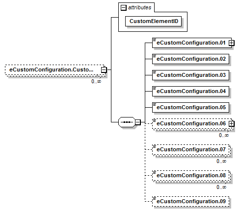 | <xs:element id="eCustomConfiguration.eCustomGroup" maxOccurs="unbounded" minOccurs="0" name="eCustomConfiguration.CustomGroup"> <xs:complexType> <xs:sequence> <xs:element id="eCustomConfiguration.eCustomDataElementTitle" minOccurs="1" name="eCustomConfiguration.01"> <xs:complexType> <xs:simpleContent> </xs:extension> </xs:simpleContent> </xs:complexType> </xs:element> <xs:element id="eCustomConfiguration.eCustomDefinition" minOccurs="1" name="eCustomConfiguration.02" type="CustomDefinition"/> <xs:element id="eCustomConfiguration.eCustomDataType" minOccurs="1" name="eCustomConfiguration.03" type="CustomDataType"/> <xs:element id="eCustomConfiguration.eCustomDataElementRecurrence" minOccurs="1" name="eCustomConfiguration.04" type="YesNoValues"/> <xs:element id="eCustomConfiguration.eCustomDataElementUsage" minOccurs="1" name="eCustomConfiguration.05" type="ElementUsage"/> <xs:element id="eCustomConfiguration.eCustomDataElementPotentialValues" maxOccurs="unbounded" minOccurs="0" name="eCustomConfiguration.06"> <xs:complexType> <xs:simpleContent> </xs:extension> </xs:simpleContent> </xs:complexType> </xs:element> <xs:element id="eCustomConfiguration.eCustomAcceptableNV" maxOccurs="unbounded" minOccurs="0" name="eCustomConfiguration.07" type="NV"/> <xs:element id="eCustomConfiguration.eCustomAcceptablePN" maxOccurs="unbounded" minOccurs="0" name="eCustomConfiguration.08" type="PN"/> <xs:element id="eCustomConfiguration.CustomDataElementGroupingID" minOccurs="0" name="eCustomConfiguration.09" type="CorrelationID"/> </xs:sequence> </xs:complexType> </xs:element> |