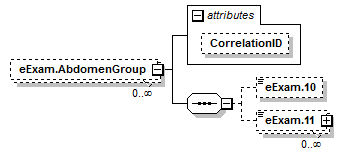 | <xs:element id="eExam.AbdomenGroup" maxOccurs="unbounded" minOccurs="0" name="eExam.AbdomenGroup"> <xs:complexType> <xs:sequence> <xs:element id="eExam.AbdomenAssessment" maxOccurs="unbounded" minOccurs="0" name="eExam.11"> <xs:complexType> <xs:simpleContent> <xs:attribute name="PN" use="optional"> <xs:simpleType> </xs:simpleType> </xs:attribute> </xs:extension> </xs:simpleContent> </xs:complexType> </xs:element> </xs:sequence> </xs:complexType> </xs:element> |