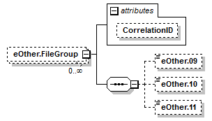 | <xs:element id="eOther.FileGroup" maxOccurs="unbounded" minOccurs="0" name="eOther.FileGroup"> <xs:complexType> <xs:sequence> <xs:element id="eOther.ExternalElectronicDocumentType" minOccurs="0" name="eOther.09"> <xs:complexType> <xs:simpleContent> </xs:simpleContent> </xs:complexType> </xs:element> <xs:element id="eOther.FileAttachmentImage" minOccurs="0" name="eOther.11"> <xs:complexType> <xs:simpleContent> </xs:simpleContent> </xs:complexType> </xs:element> </xs:sequence> </xs:complexType> </xs:element> |
